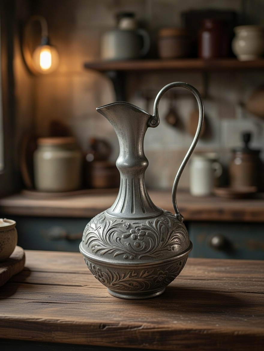 Parfaite pour des décors de table bourgeoise, ambiances anciennes, scènes historiques ou compositions en nature morte, cette aiguière capte particulièrement bien la lumière grâce à ses reliefs travaillés.