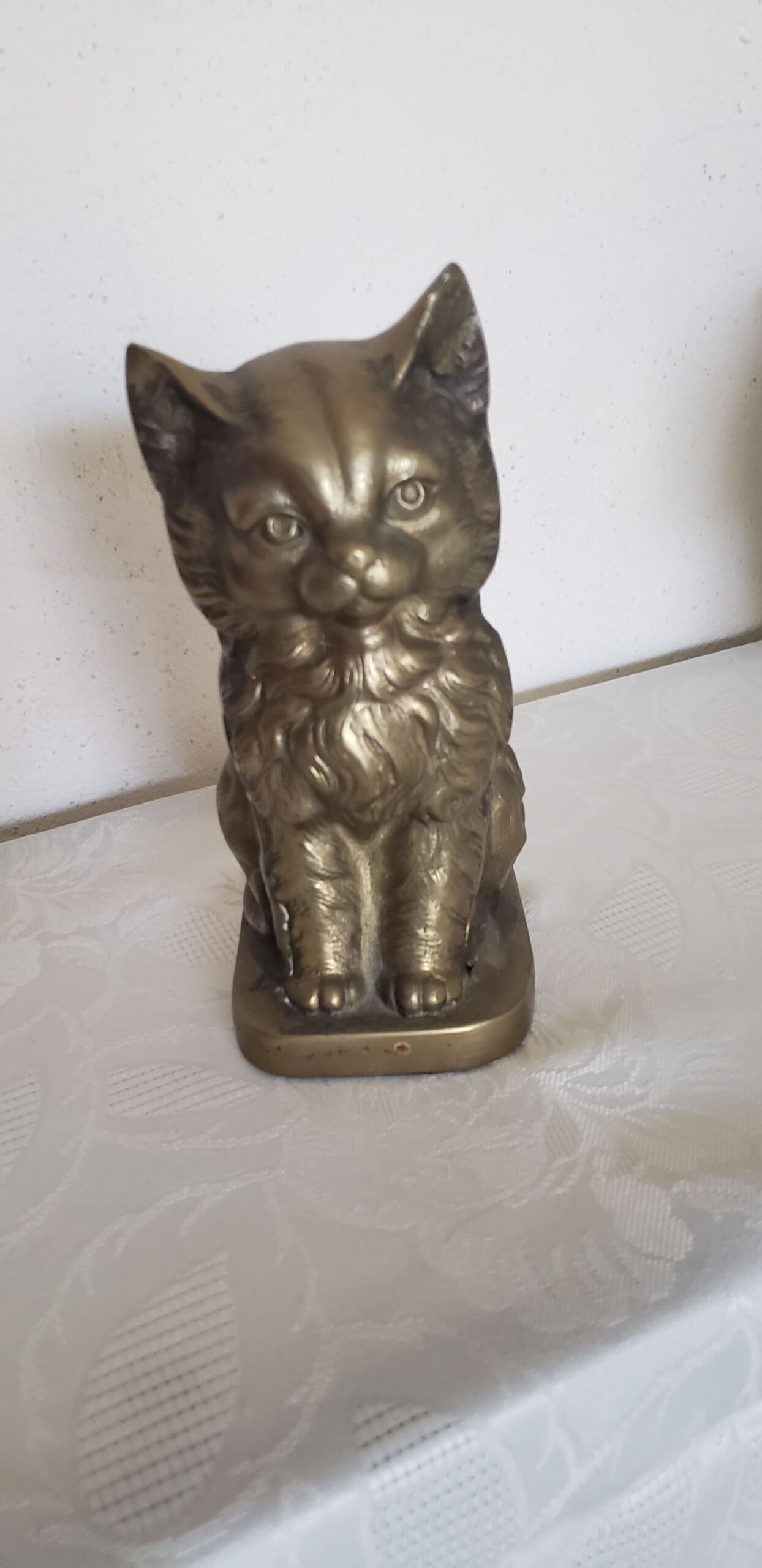 Bibelot décoratif en laiton représentant un chat finement moulé. Expression douce et stylisée, avec détails marqués sur le pelage et le visage. Belle patine dorée, légèrement assombrie par le temps, apportant une touche vintage et chaleureuse.