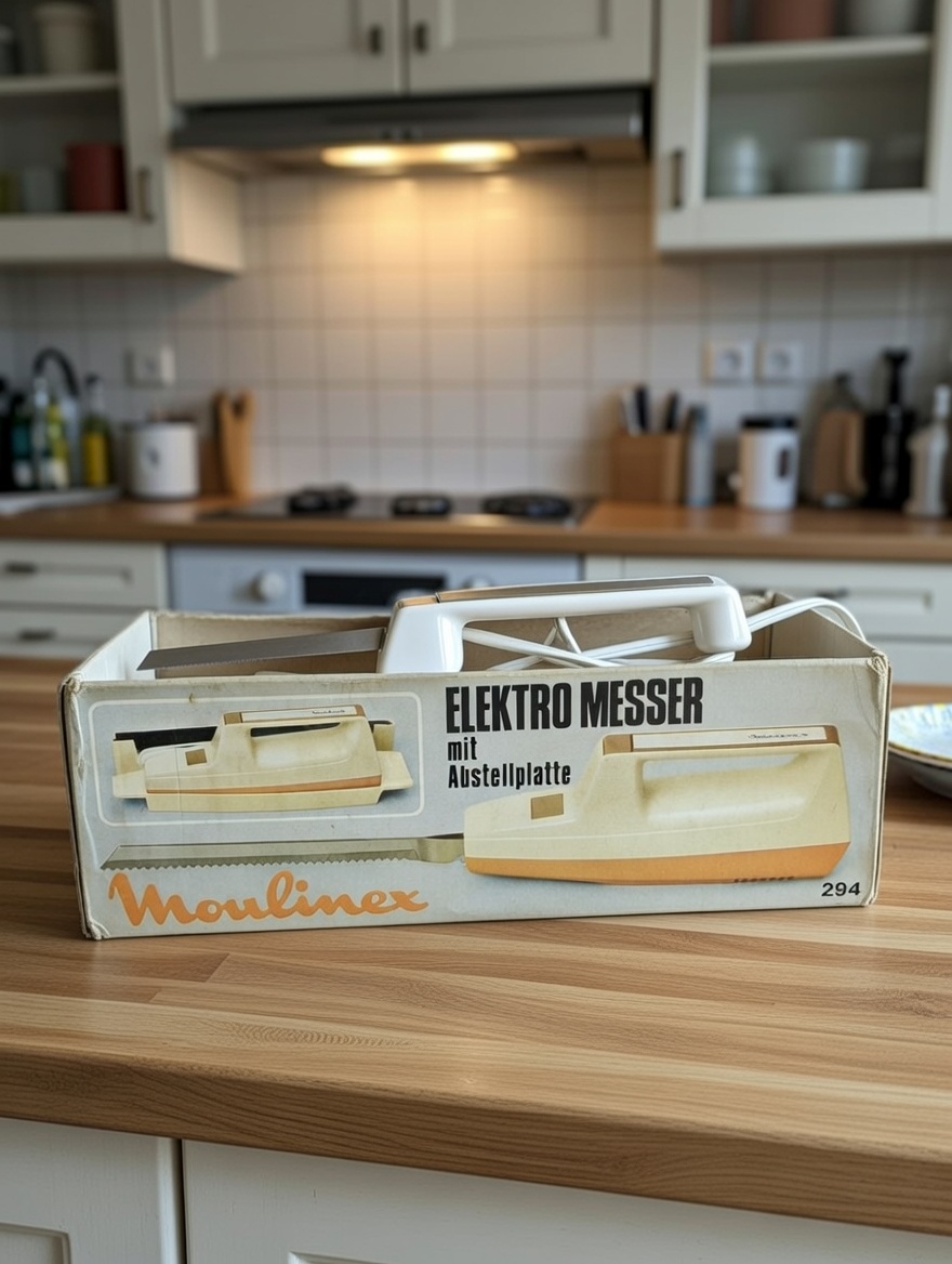 Couteau électrique vintage Moulinex, modèle filaire, présenté dans sa boîte d’origine. Esthétique typique de l’électroménager français des années 70–80, idéal pour recréer une cuisine rétro ou une ambiance domestique authentique.