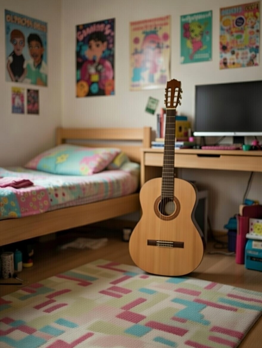 Instrument d’étude idéal pour décors de chambre d’enfant, d’adolescent ou ambiance musicale domestique. Son format plus compact qu’une guitare adulte lui donne une présence réaliste dans un univers scolaire ou familial.