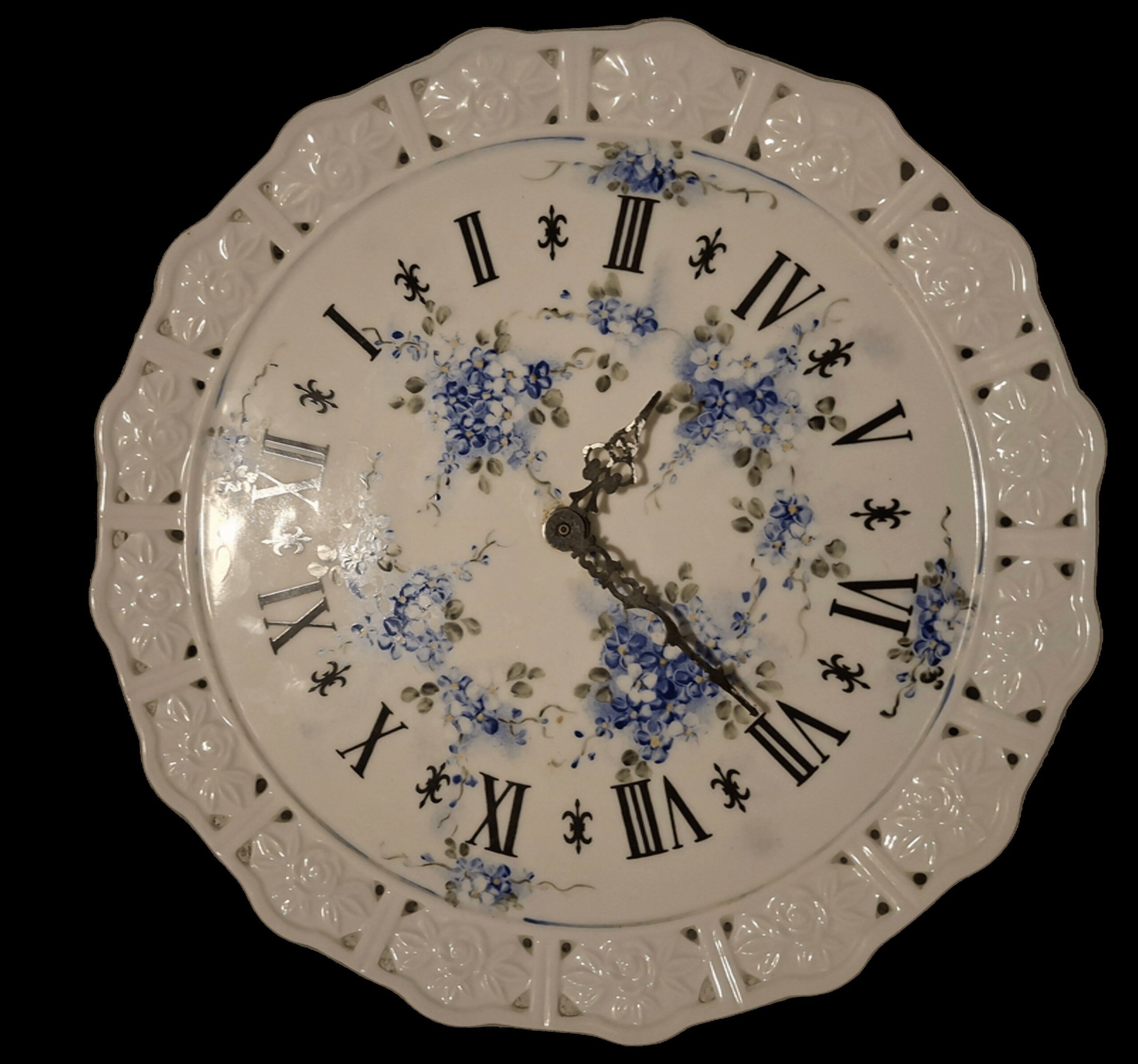 Horloge murale en faïence émailée, décorée de motifs floraux bleus de style traditionnel. Les chiffres romains noirs contrastent avec le fond clair, tandis que le pourtour ajouré et ondulé apporte un relief décoratif marqué. Objet typique des intérieurs anciens pouvant servir pour recréer une ambiance campagne, cuisine ou décor rétro. Fonctionnelle, accrocge au mur possible, […]