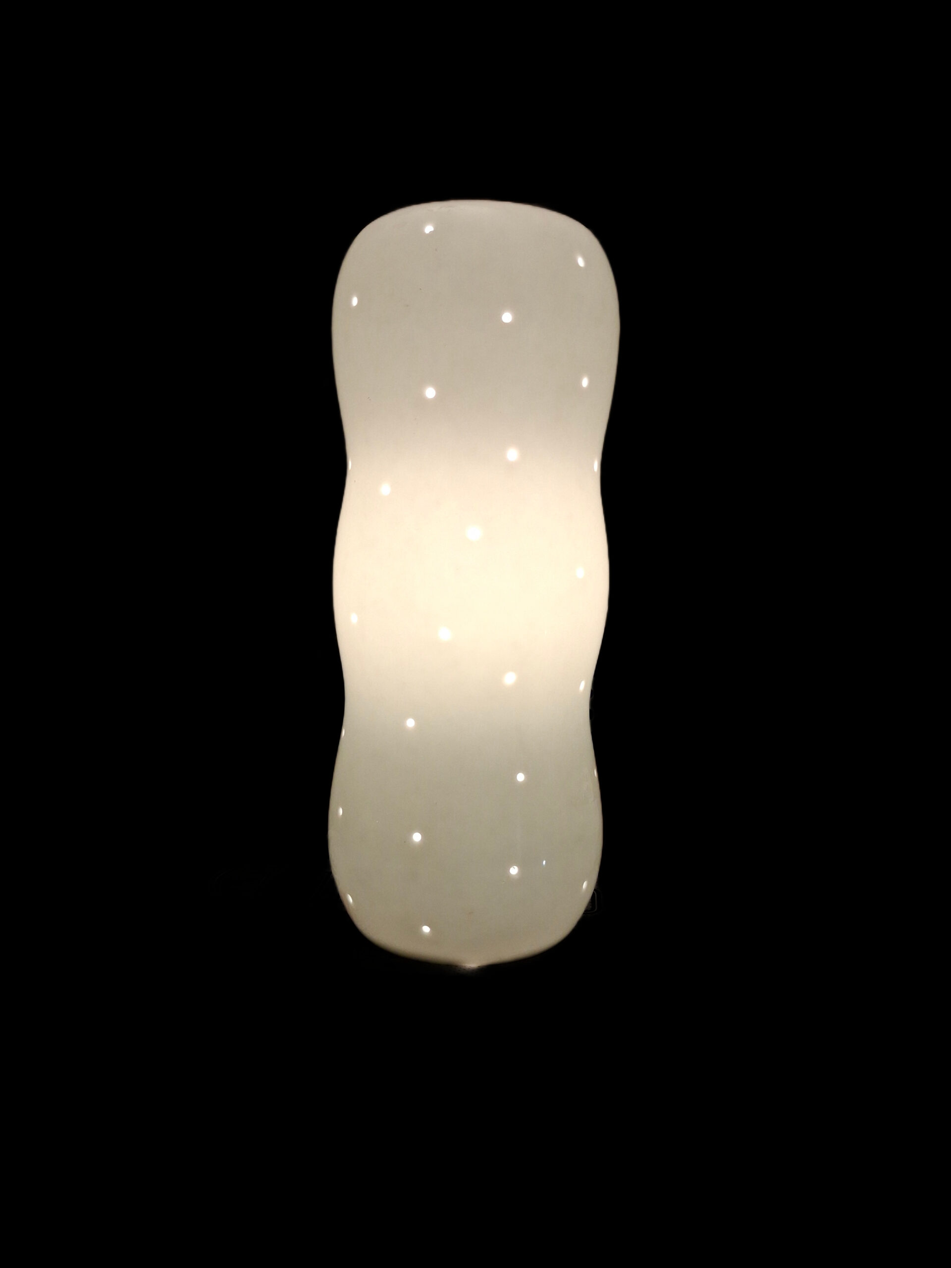 Lampe décorative au design organique et sculptural, en verre opalin blanc. La surface est délicatement perforée de micro-point lumineux qui filtrent une lumière douce et diffuse, créant une ambiance chalereuse sans attirer excessivement l’attention sur une image.