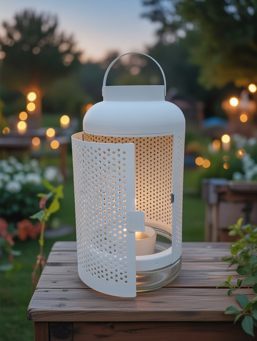 Photophore cylindrique en métal perforé blanc, avec base en verre et porte-bougie intégré.