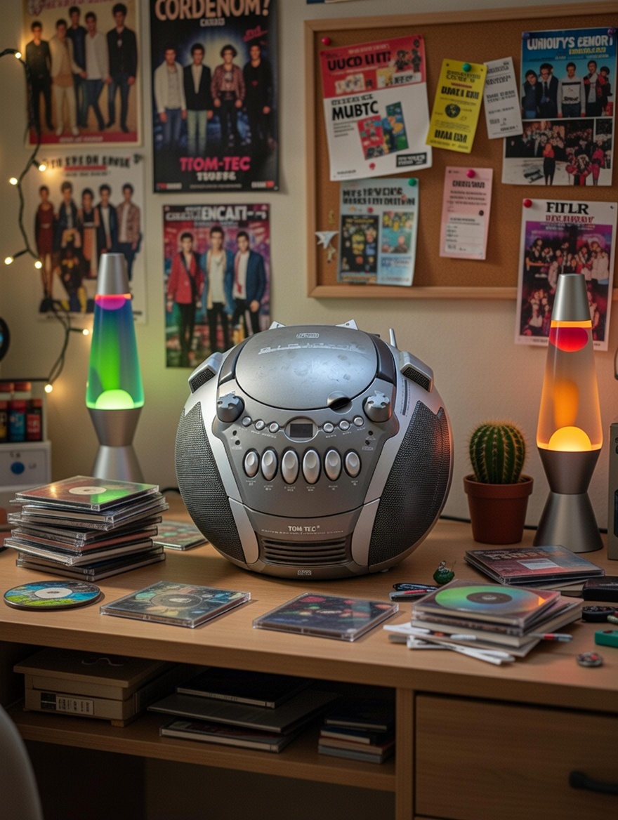 Objet emblématique des chambres d’adolescents du début des années 2000, idéal pour recréer une ambiance musicale de l’époque (CD, compilations, radio FM).