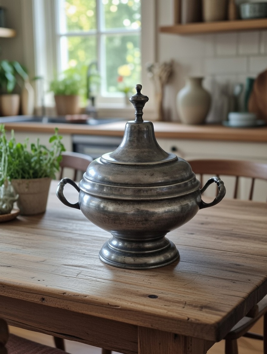 Soupière ancienne en étain massif, munie de deux anses latérales et d’un couvercle surmonté d’un bouton.