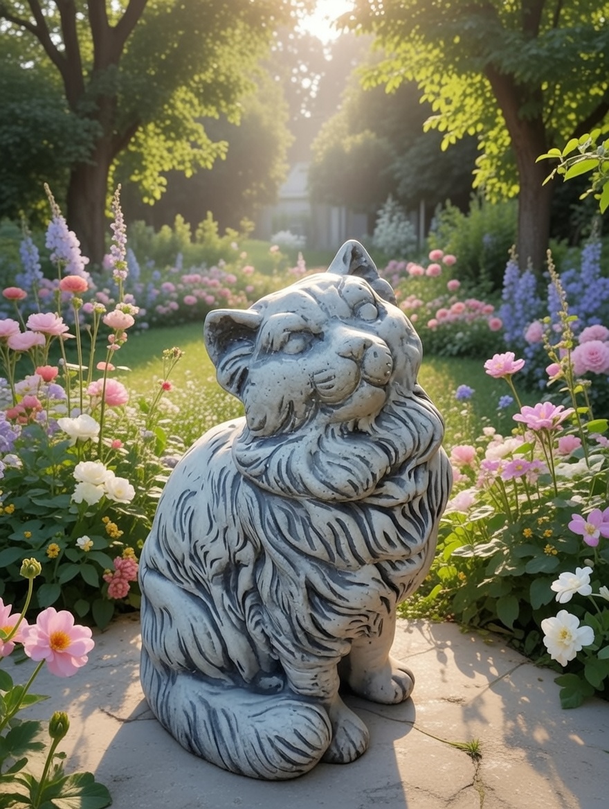 Statuette décorative représentant un chat assis, réalisée en pierre reconstituée. Le modelé détaillé et la patine claire lui donnent un aspect intemporel, adapté aussi bien aux décors de jardin, terrasse ou parc qu’à des mises en scène intérieures (véranda, hall, décor naturaliste).