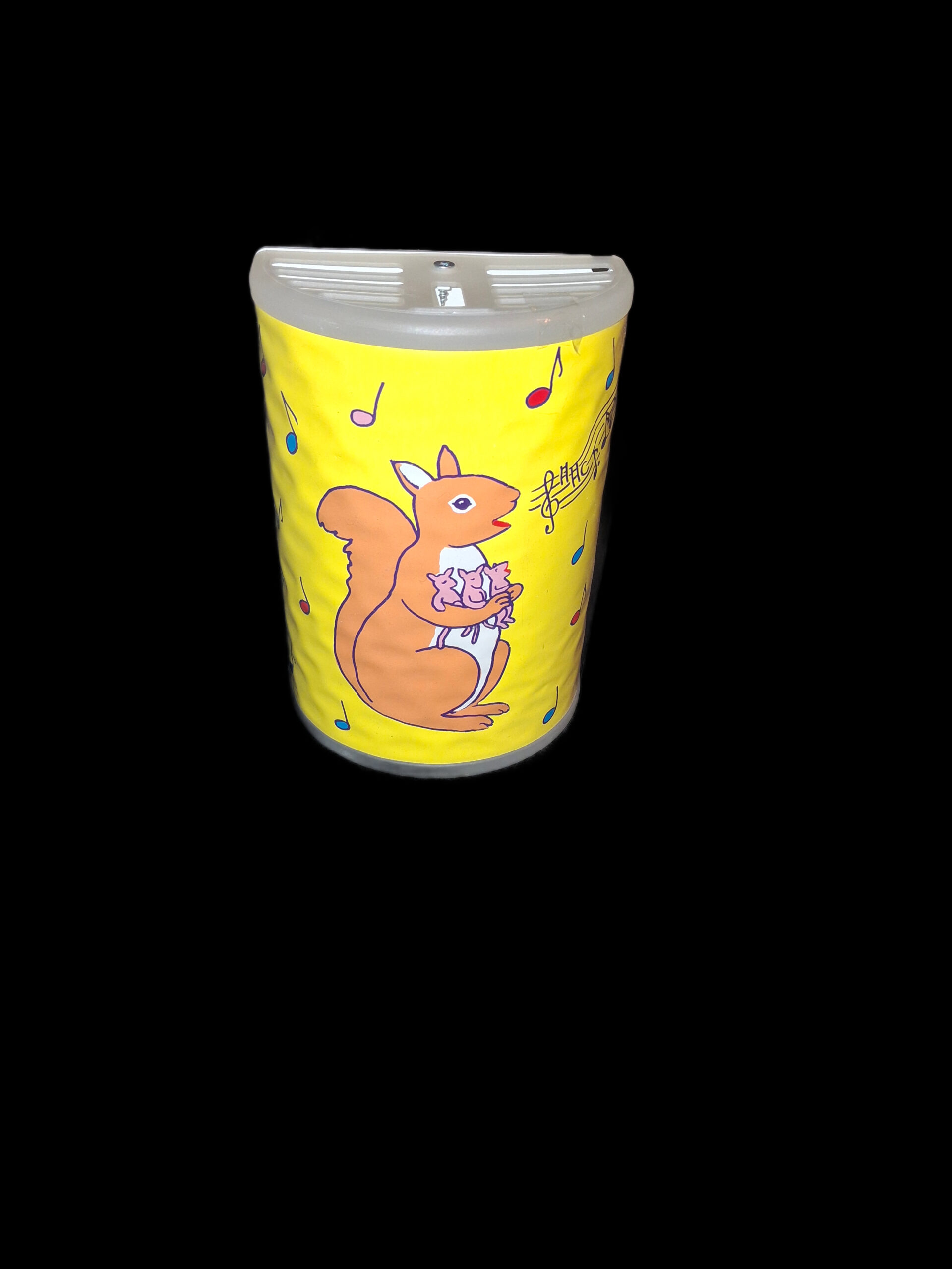 Veilleuse décorative pour chambre d’enfant, en plastique translucide, illustrée d’écureuil tenant ses petits et entouré de note de musique. Diffuse une lumère douce et rassurante, adaptée aux ambiances nocturnes ou aux décors de chambres enfant.